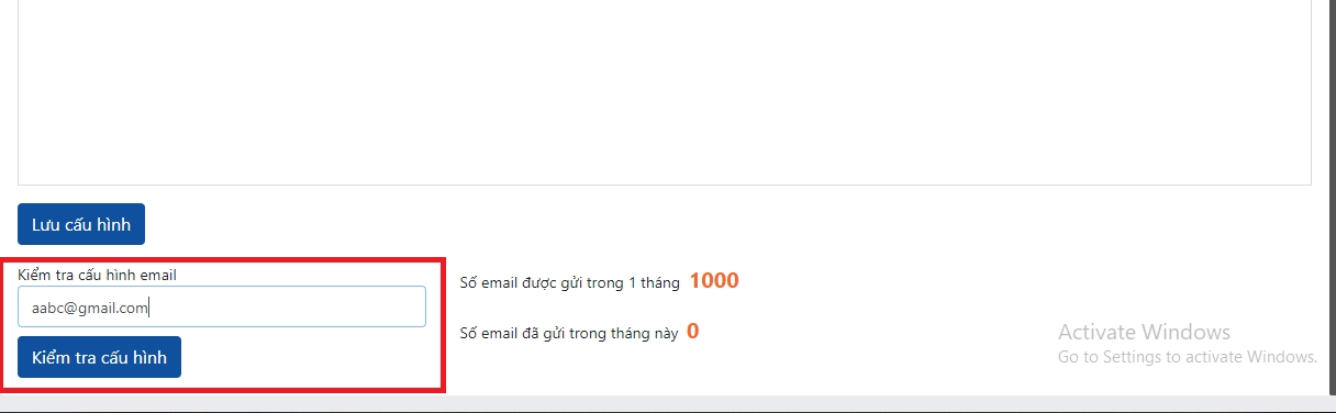 Sau đấy kéo xuống màn hình đến dòng " Kiểm tra cấu hình email" nhập tài khoản Gmail trên vào đây nhấn " Kiểm tra cấu hình" nếu việc cấu hình thành công hệ thống sẽ thông báo " Gửi email thành công. Vui lòng kiểm tra hòm thư"