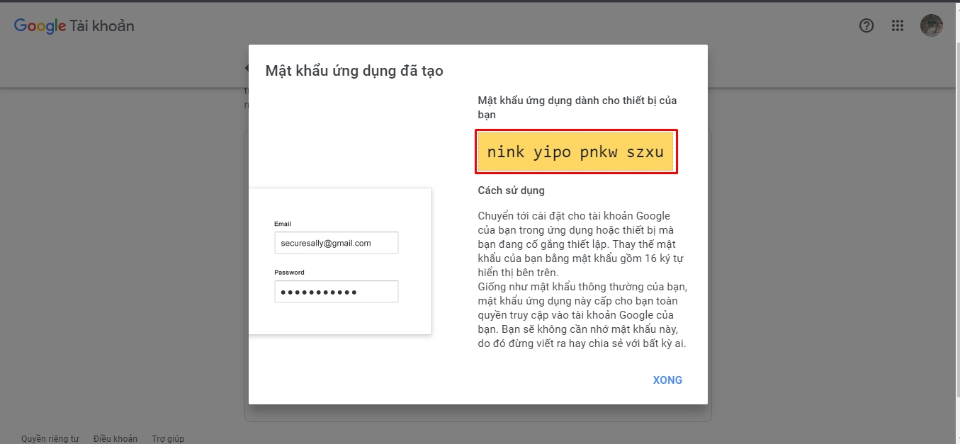 Bước 4: Sau khi tạo sẽ có mật khẩu ứng dụng được tạo ra, điền mật khẩu này vào phần mật khẩu tích hợp trong Getfly.