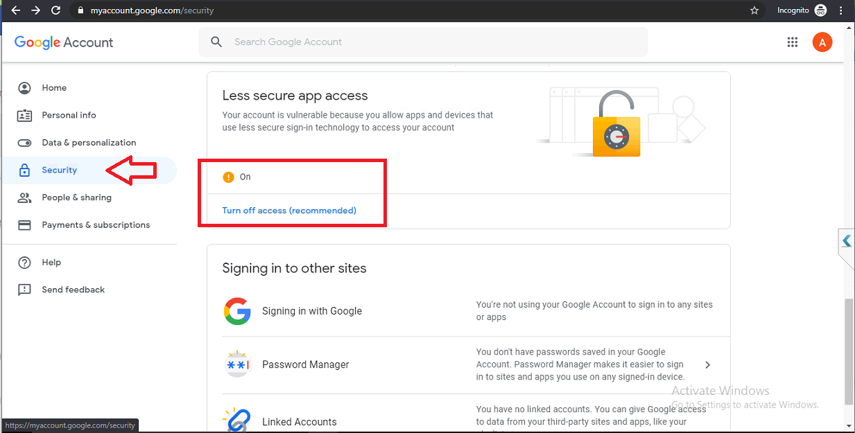 - Anh/chị chọn Security -> Less secure app access -> click Turn on access và bật On như màn hình dưới là đã xong