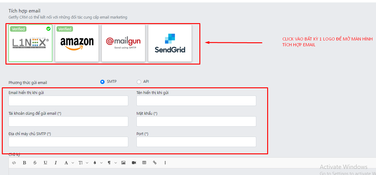 Click vào tên hiển thị của Anh/ Chị ở góc phải màn hình sau đó chọn " Cài đặt" => Tích hợp => chọn "Email Marketing" màn hình cấu hình Email sẽ được hiển ra. Anh / chị vui lòng điền đầy đủ các thông tin
