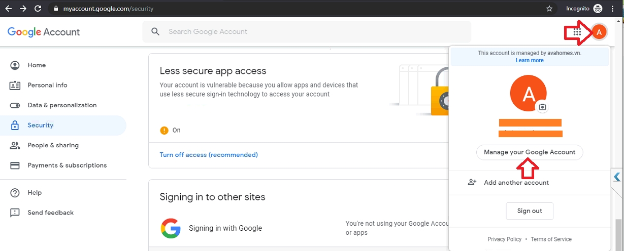 - Đăng nhập tài khoản admin mail tên miền -> chọn Manage your Google Account