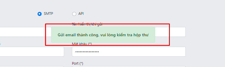 Sau đấy kéo xuống màn hình đến dòng " Kiểm tra cấu hình email" nhập tài khoản Gmail trên vào đây nhấn " Kiểm tra cấu hình" nếu việc cấu hình thành công hệ thống sẽ thông báo " Gửi email thành công. Vui lòng kiểm tra hòm thư"