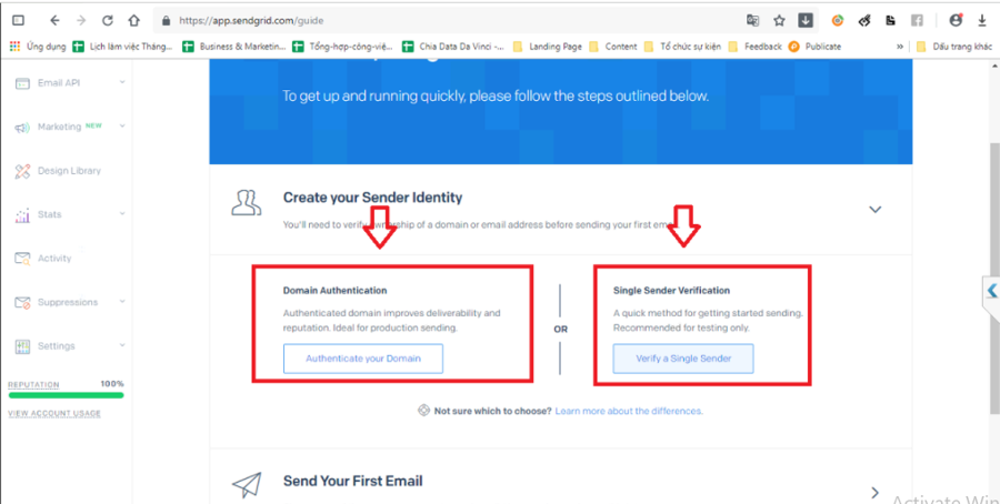 Sau khi hoàn thành đăng ký tài khoản Email Sendgrid, để bắt đầu gửi email anh chị cần tạo định danh tài khoản gửi mail