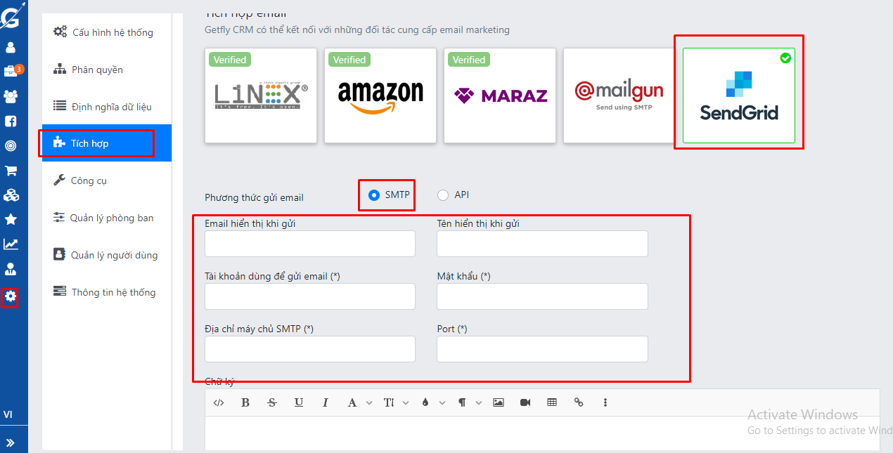 Click Cài đặt-> Tích hợp -> tích hợp email -> chọn Sendgrid