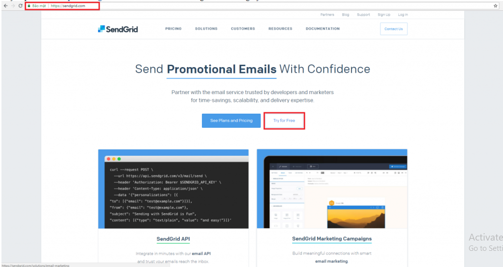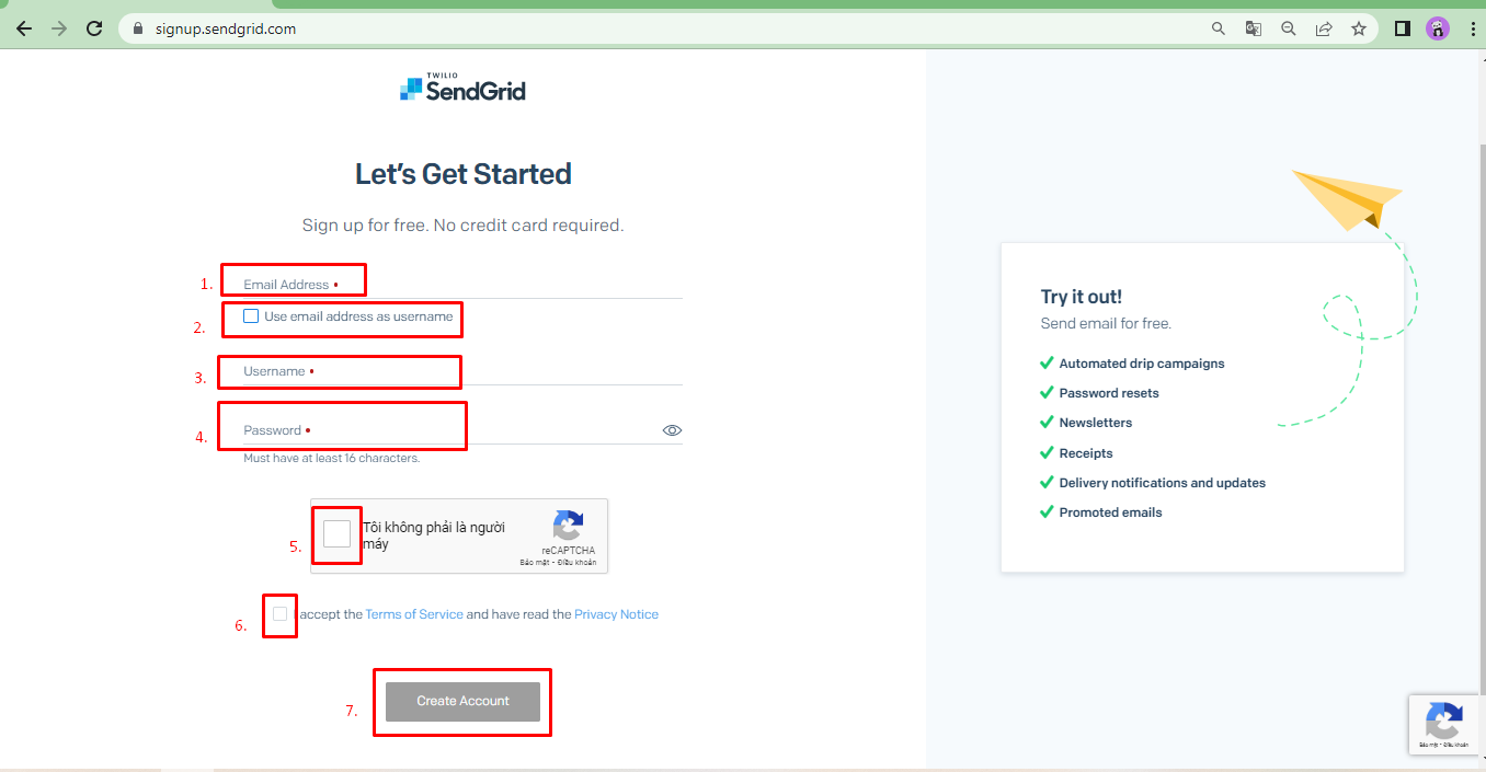 Trong ví dụ này chúng tôi sẽ hướng dẫn anh chị đăng ký 1 tài khoản miễn phí của Sendgrid.