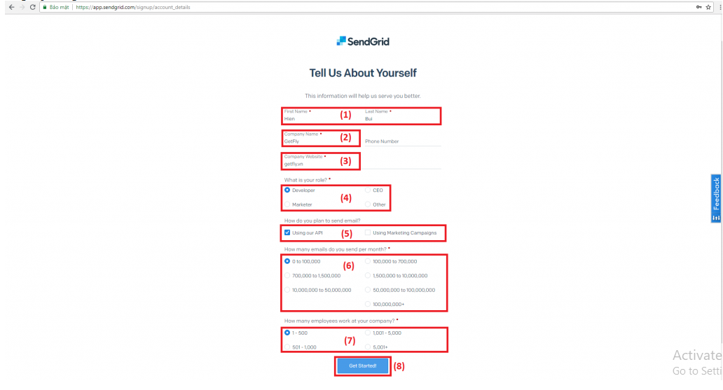 Bước 2: Tạo các thông tin trên Sendgrid để tích hợp vào Getfly