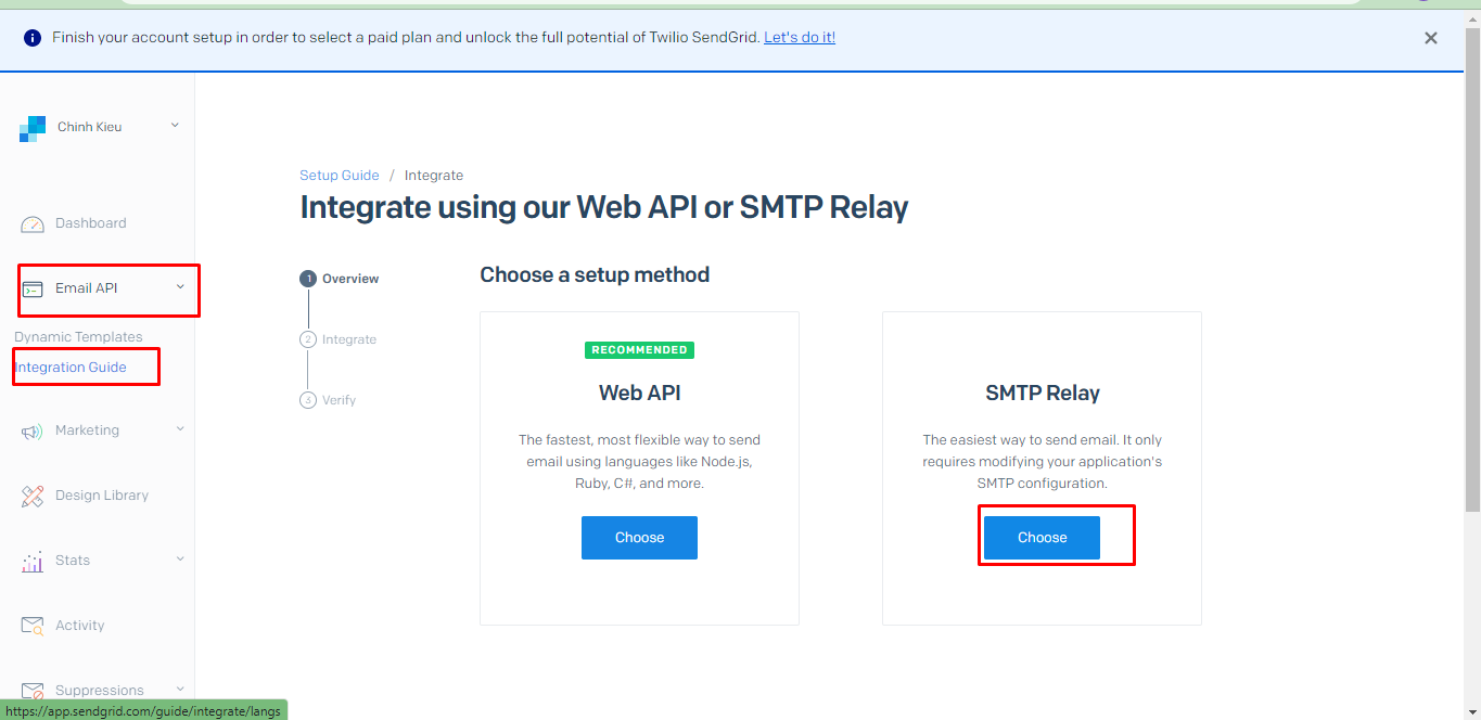 Anh/chị thao tác click vào Email API => Integration Guite => Chọn SMTP Relay