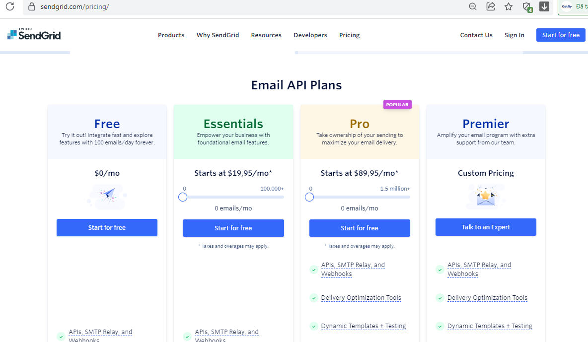 1. Gói free: Tích hợp nhanh và khám phá các tính năng với 100 email mỗi ngày. Giá $0 / tháng 2. Gói Essentials: Lý tưởng cho các doanh nghiệp sử dụng các tính năng mail cơ bản, có thể gửi tới 100.000 email / tháng Bắt đầu từ $19,95/tháng tương ứng gửi được đến 60.000 email/ tháng. Bắt đầu từ $34.95/tháng tương ứng gửi được từ 60.000-100.000/email/ tháng. 3. Gói Pro: Lý tưởng cho các doanh nghiệp gửi từ 100.000 đến 1,5 triệu email / tháng - Gói Pro 100k: Bắt đầu từ $89,95/tháng tương ứng gửi được đến 250.000 email - Gói Pro 300k: Bắt đầu từ $249/tháng tương ứng gửi được đến 650.000 email - Gói Pro 700k: Bắt đầu từ $449/tháng tương ứng gửi được đến 1.300.000 email - Gói Pro 1.5M: Bắt đầu từ $749/tháng tương ứng gửi được đến 1.300.000-1.400.000 email - Lớn hơn 1.500.000 email giá Tùy chỉnh 4. Gói Premier: Tùy chỉnh
