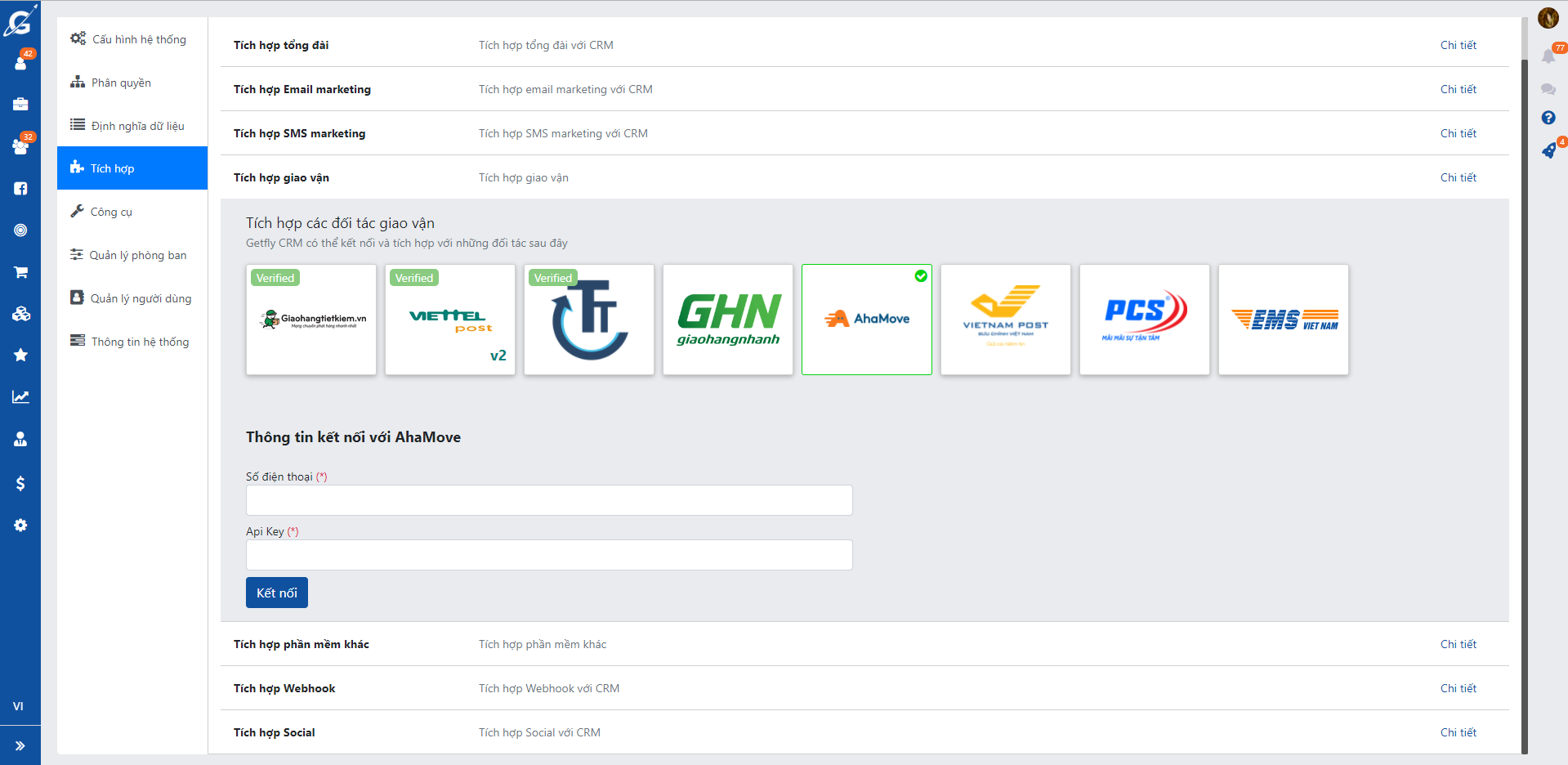 Truy cập vào hệ thống Getfly => Cài đặt => Tích hợp => Tích hợp giao vận => Chọn đối tác Ahamove
