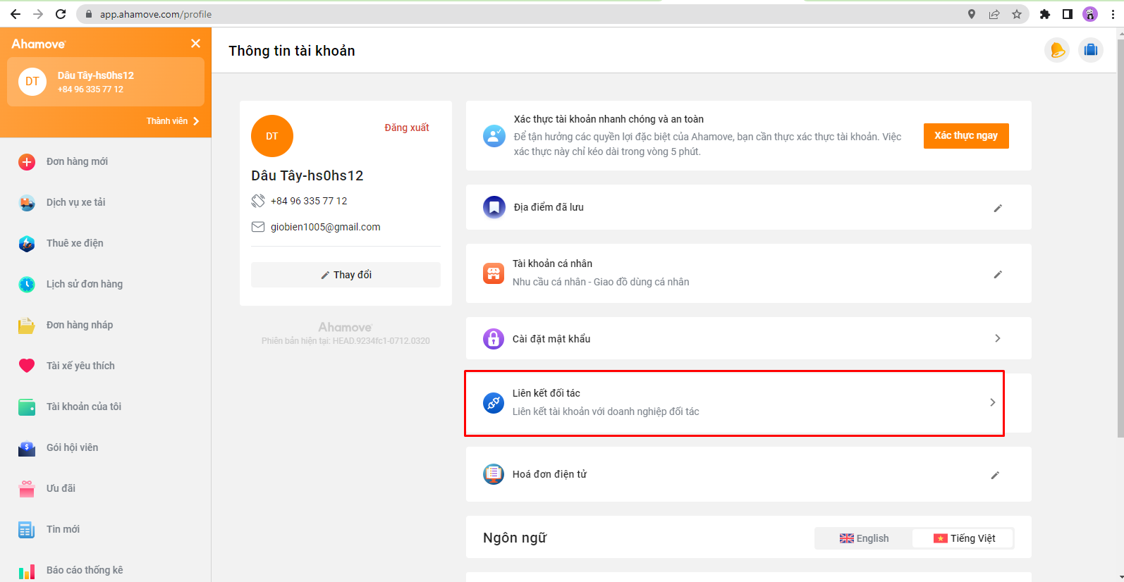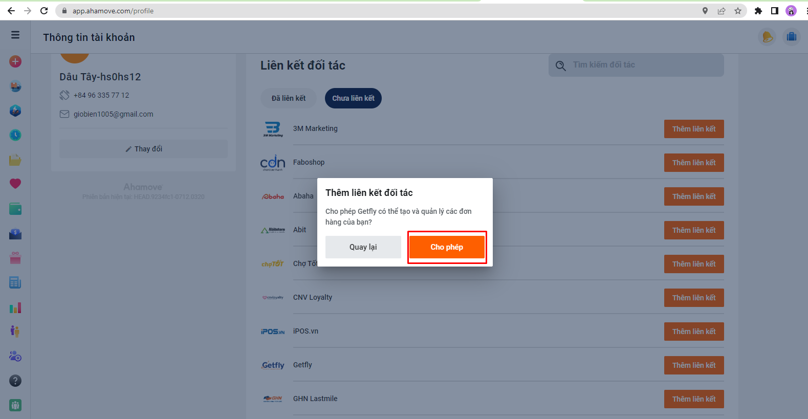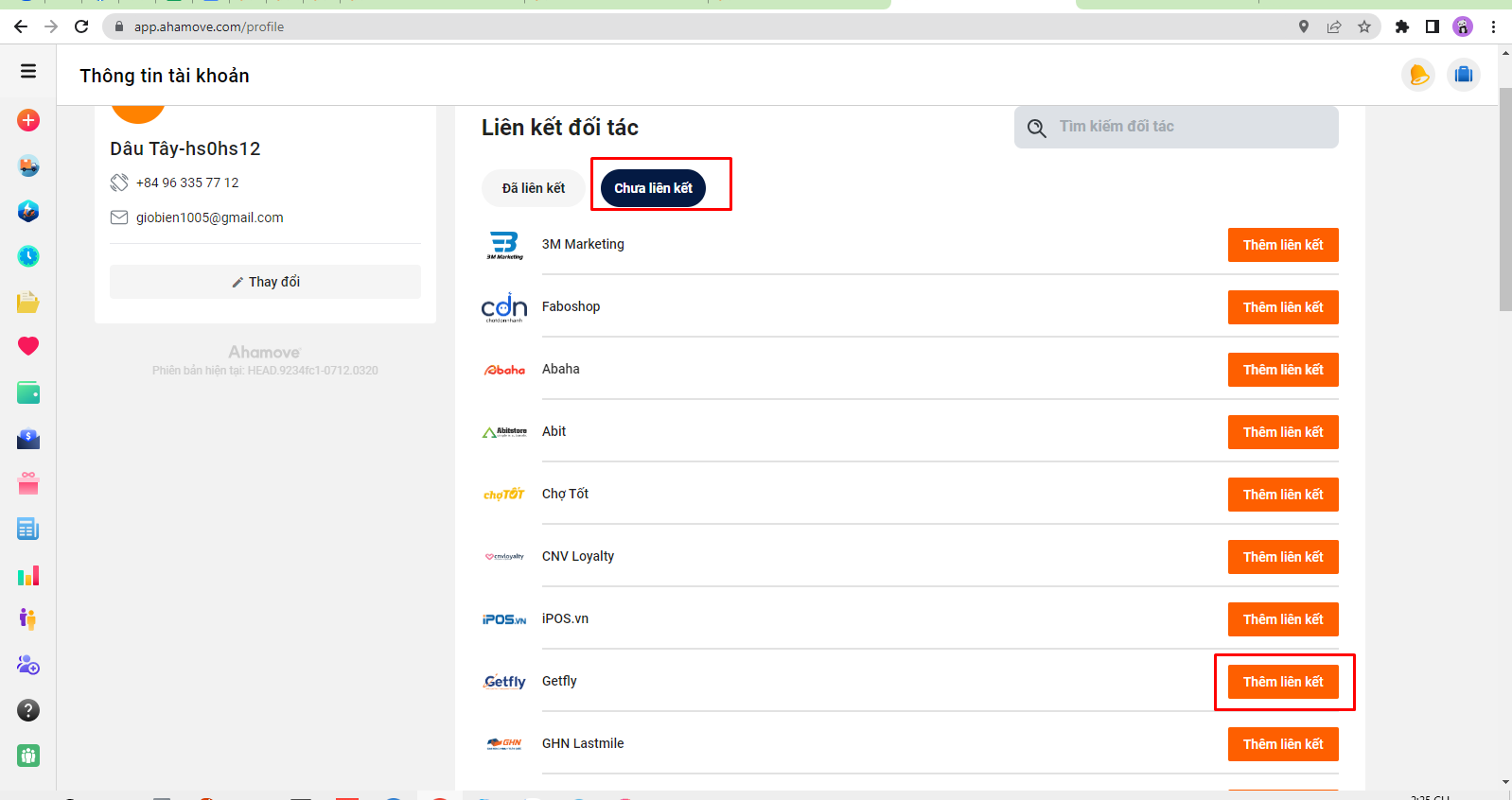 Anh/ chị vào mục Thông tin cá nhân trên Ahamove => Liên kết đối tác => Chưa liên kết => Chọn Getfly và Thêm liên kết