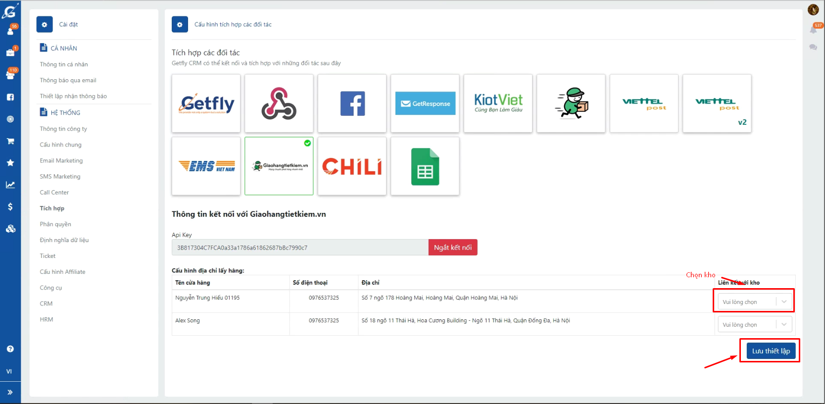 Bước 2: Truy cập vào hệ thống Getfly => Cài đặt => Tích hợp => Tích hợp giao vận => Chọn đối tác Giao hàng tiết kiệm