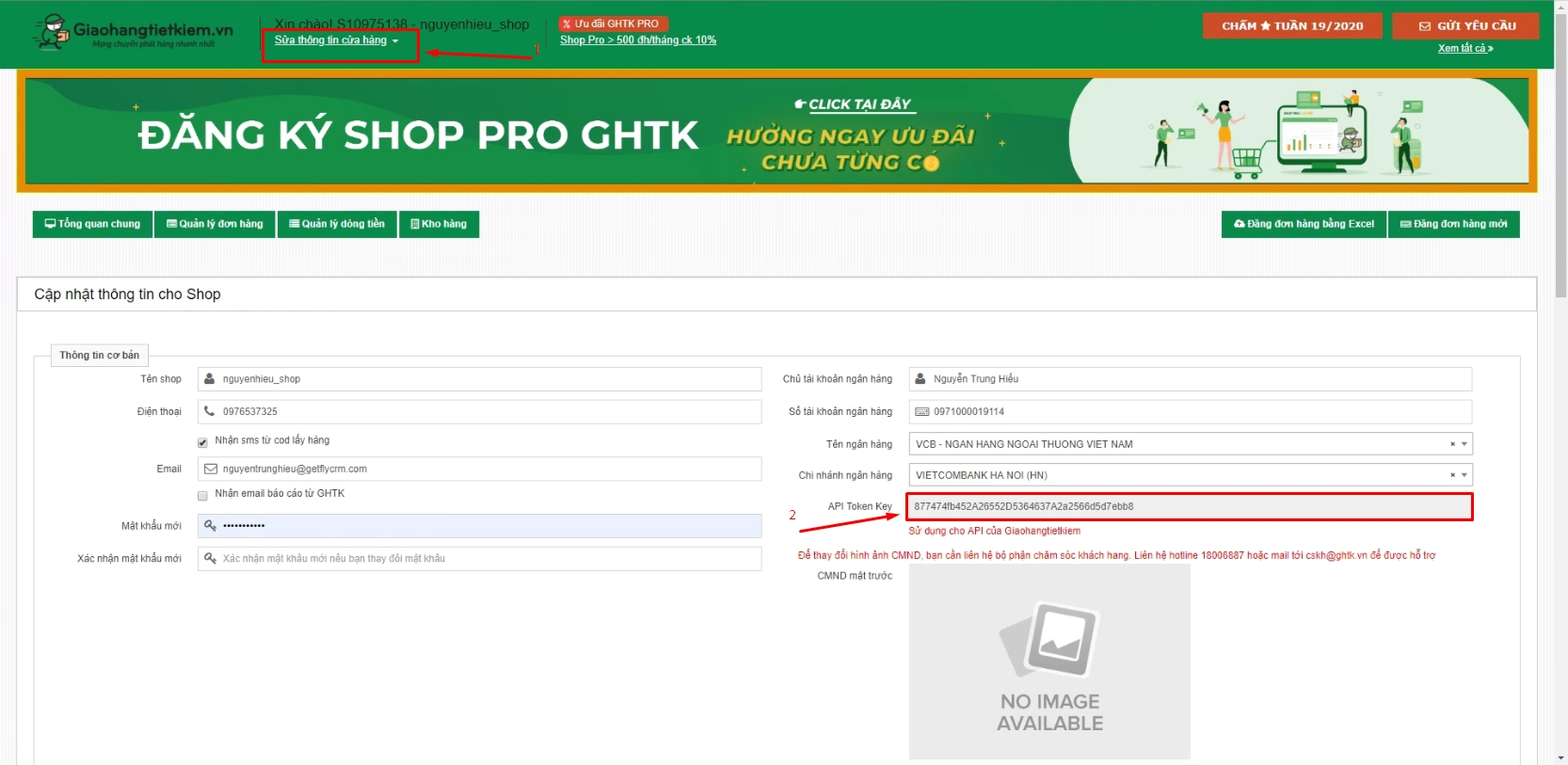 Bước 1: Anh/chị truy cập vào hệ thống Giao hàng tiết kiệm => Sửa thông tin cửa hàng => Lấy thông tin API Key