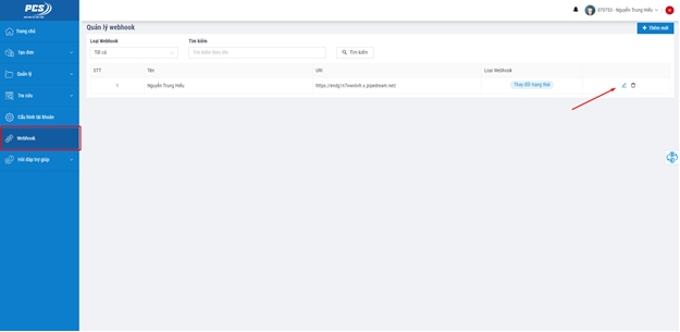 Bước 1. Truy cập vào hệ thống PCS đăng kí webhook trên hệ thống PCS( chi tiết như hình ảnh phía dưới )