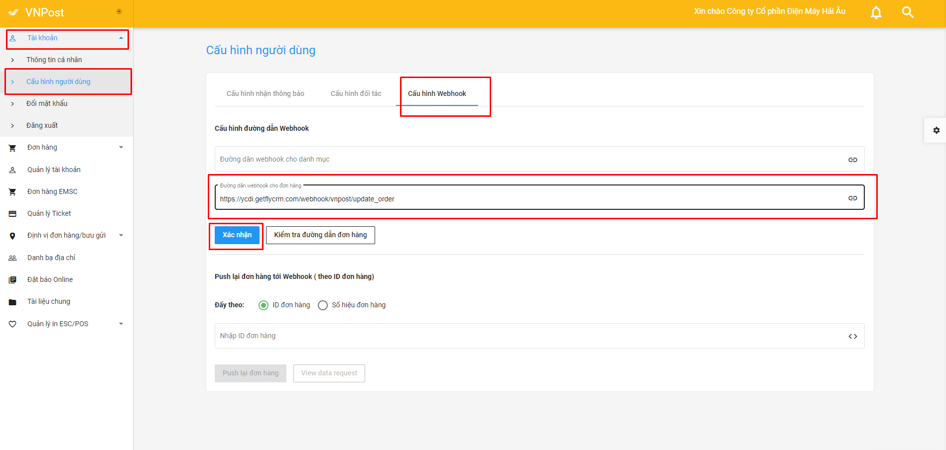 Trên trang Quản lý VnPost, anh/chị vào Tài khoản -> Cấu hình người dùng -> Cấu hình Webhook