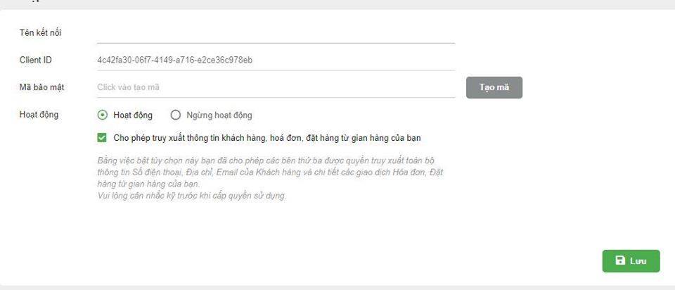 - Anh/chị lưu ý nhớ tích chọn vào mục "Cho phép truy xuất thông tin khách hàng, hóa đơn, đặt hàng từ gian hàng của bạn." thì các thông tin từ kiotviet mới đổ về Getfly.
