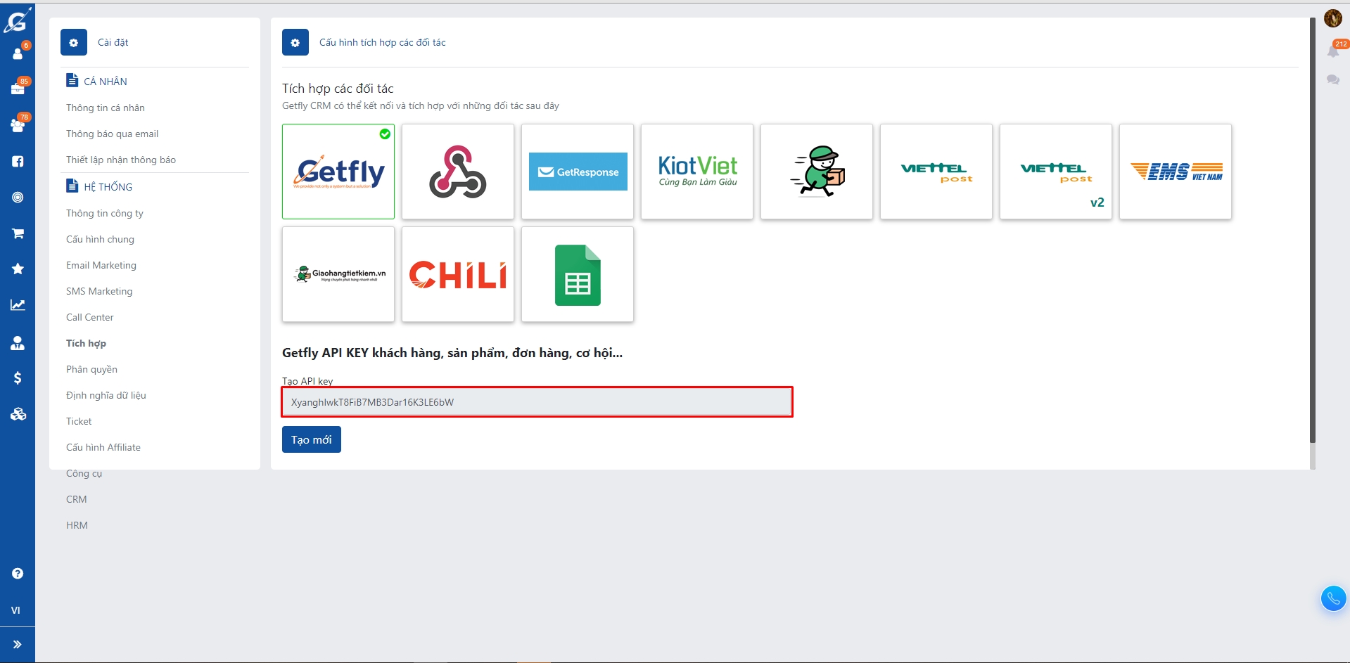 - Api key: Api key lấy trong phần tích hợp của Getfly