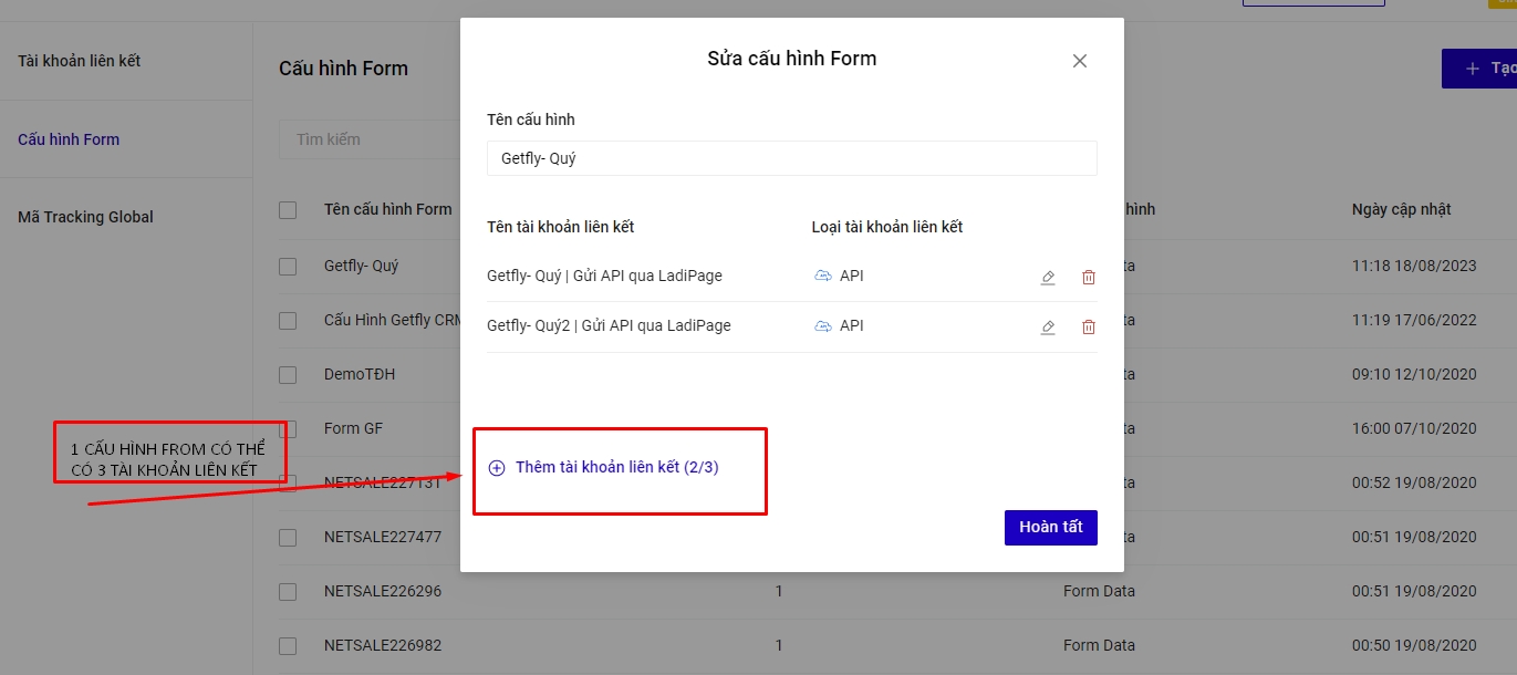 - 1 cấu hình Form có thể tạo tối đa 3 tài khoản liên kết=> Có nghĩa 1 Form của LadiVn có thể đổ thông tin về 3 hệ thống Getfly