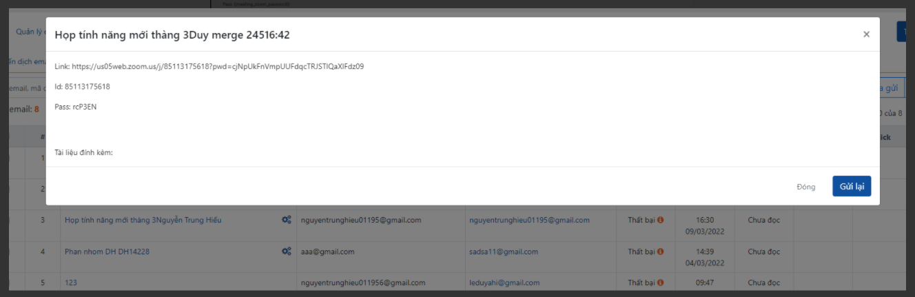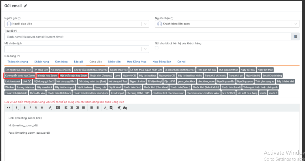 - Trường hợp auto gửi mail cho khách hàng sẽ áp dụng cho trường hợp gửi cho người nhận việc, KH liên quan (KH đã tồn tại trên hệ thống) người tham gia, nhân viên trong công ty,.. còn đối với khách sinh ra khi tích chọn lead đổ về khi tạo phòng zoom không áp dụng, do khi tạo công việc chưa có khách sinh ra.
