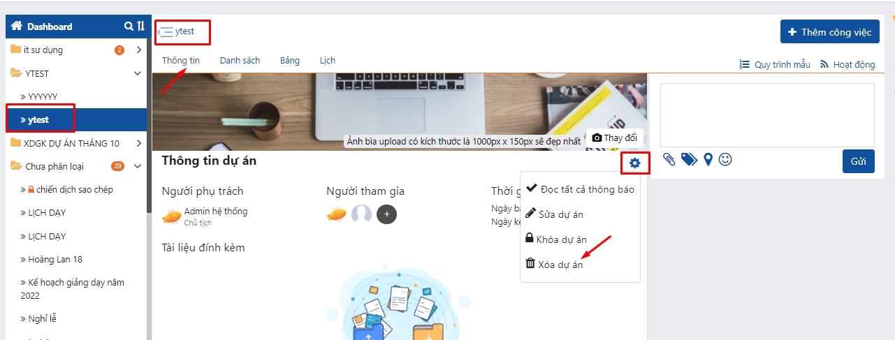 Để xóa dự án công việc, anh/chị thao tác như sau: