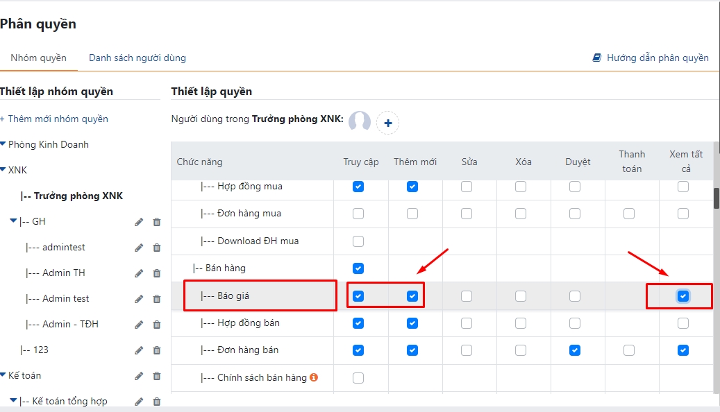 Có quyền Truy cập và thêm mới ở Báo giá sẽ xem được báo giá do tài khoản đó là người tạo hoặc là người thực hiện báo giá (cần được xem thông tin khách hàng liên quan đến báo giá)