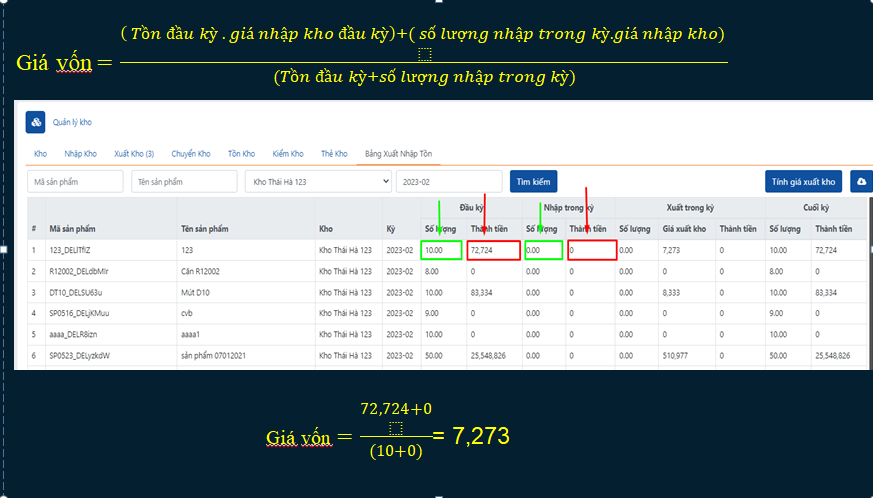 - Giá vốn xuất kho được tính theo công thức sau Giá vốn xuất kho = (Tồn đầu kỳ x giá nhập kho đầu kỳ + Số lượng nhập kho trong kỳ x giá nhập kho trong kỳ)/ ( Tồn đầu kỳ + Số lượng nhập kho trong kỳ)