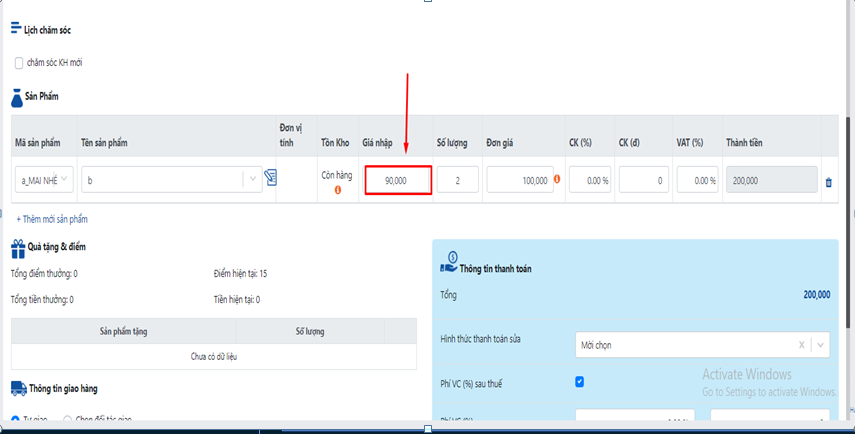 - Trường hợp đơn hàng có sản phẩm dịch vụ mà không mở ô giá nhập thì giá nhập của sản phẩm dịch vụ được tính mặc định = 0.