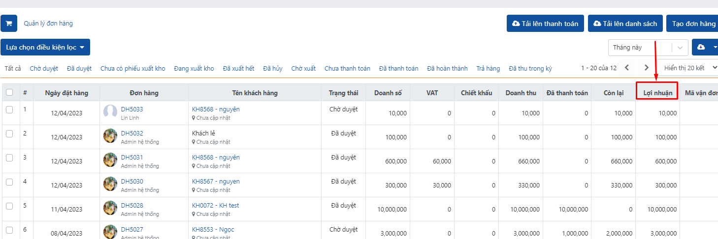 - Để xem được lợi nhuận đơn hàng cần tài khoản cần có quyền Lợi nhuận ĐH