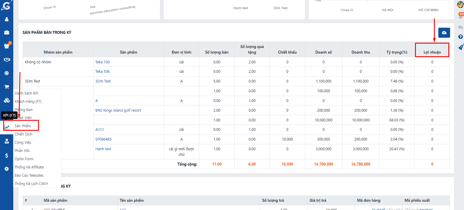 Khi tài khoản đã có quyền anh/chị vào mục thống kê KPI ( F7) chọn mục Sản phẩm, thông tin lợi nhuận sản phẩm sẽ được thể hiện ở bảng Sản phẩm bán trong kỳ