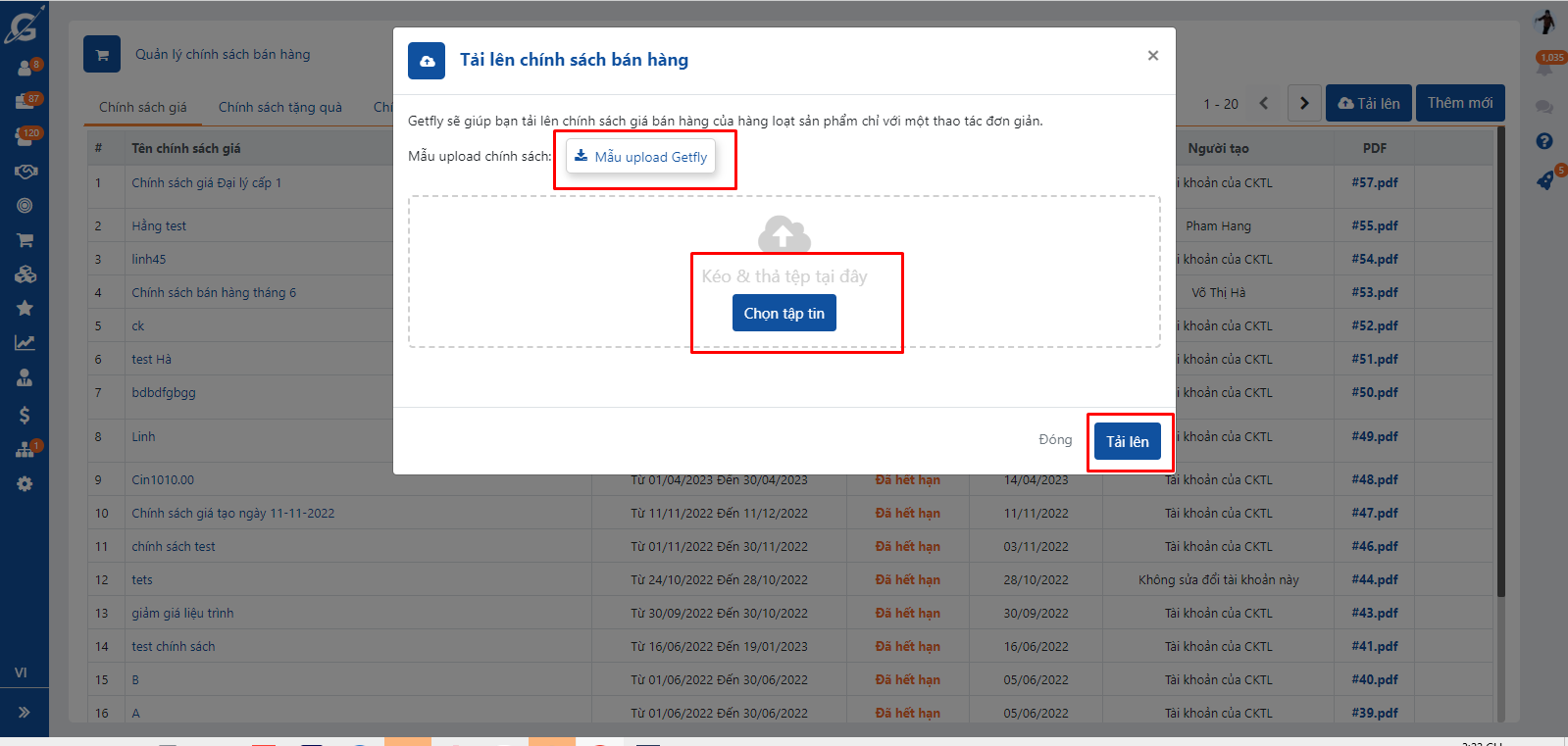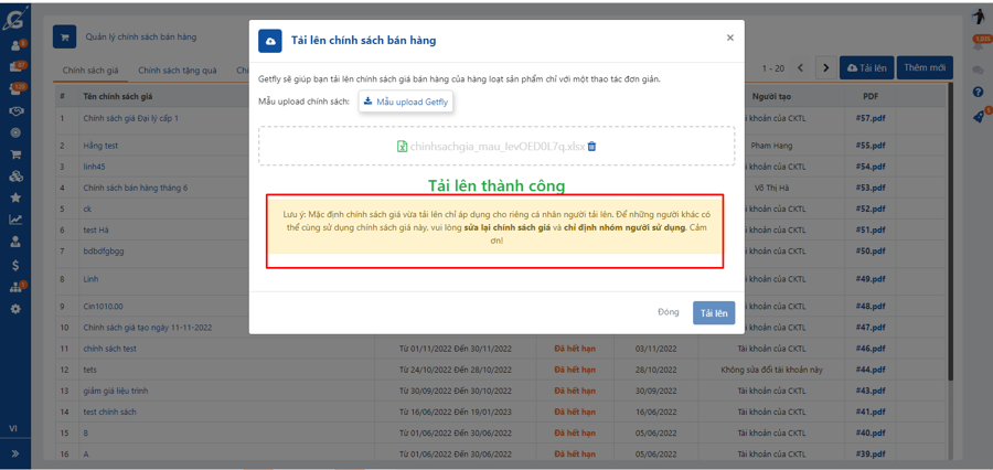 Sau khi điền xong file Excel, anh/ chị thao tác tải dữ liệu lên. Lưu ý: Mặc định chính sách giá vừa tải lên chỉ áp dụng cho riêng cá nhân người tải lên. Để những người khác có thể cùng sử dụng chính sách giá này, vui lòng sửa lại chính sách giá và chỉ định nhóm người sử dụng . Và nhóm khách hàng áp dụng chính sách giá.