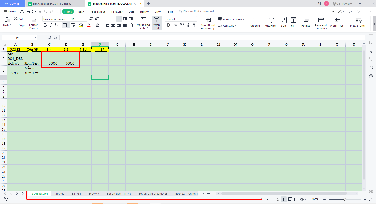 Anh/ chị thao tác điền file theo file mẫu. Ở bảng Excel, mỗi một sheet sẽ là một nhóm sản phẩm. Nhóm sản phẩm nào không áp dụng chính sách giá, anh/ chị có thể xóa đi. Anh/ chị thao tác điền giá theo từng mức độ sản phẩm sẽ áp dụng chính sách giá nào. ( Chỉ điền được giá sản phẩm theo từng khoảng, không áp dụng được mức chiết khấu)