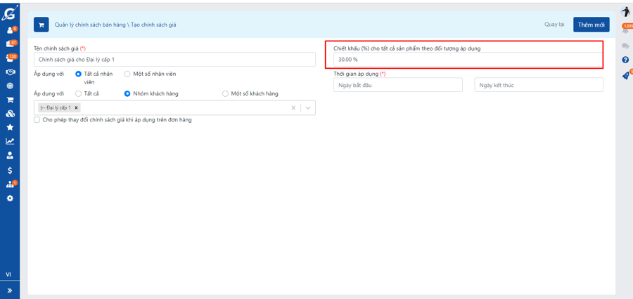 Chọn thời gian áp dụng chính sách giá cho Đại lý.