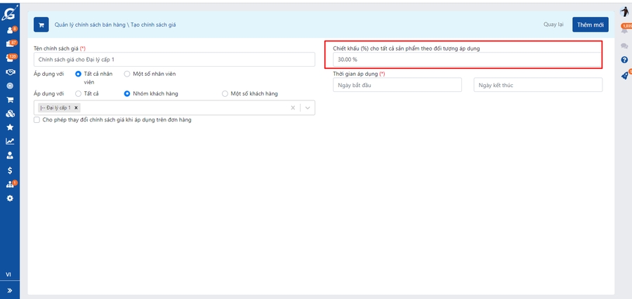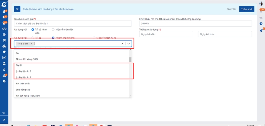 Ở bước thêm mới, anh/ chị điền các thông tin cụ thể để cài đặt cho chính sách giá cho đại lý các cấp