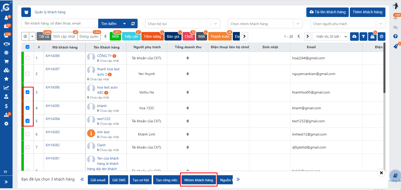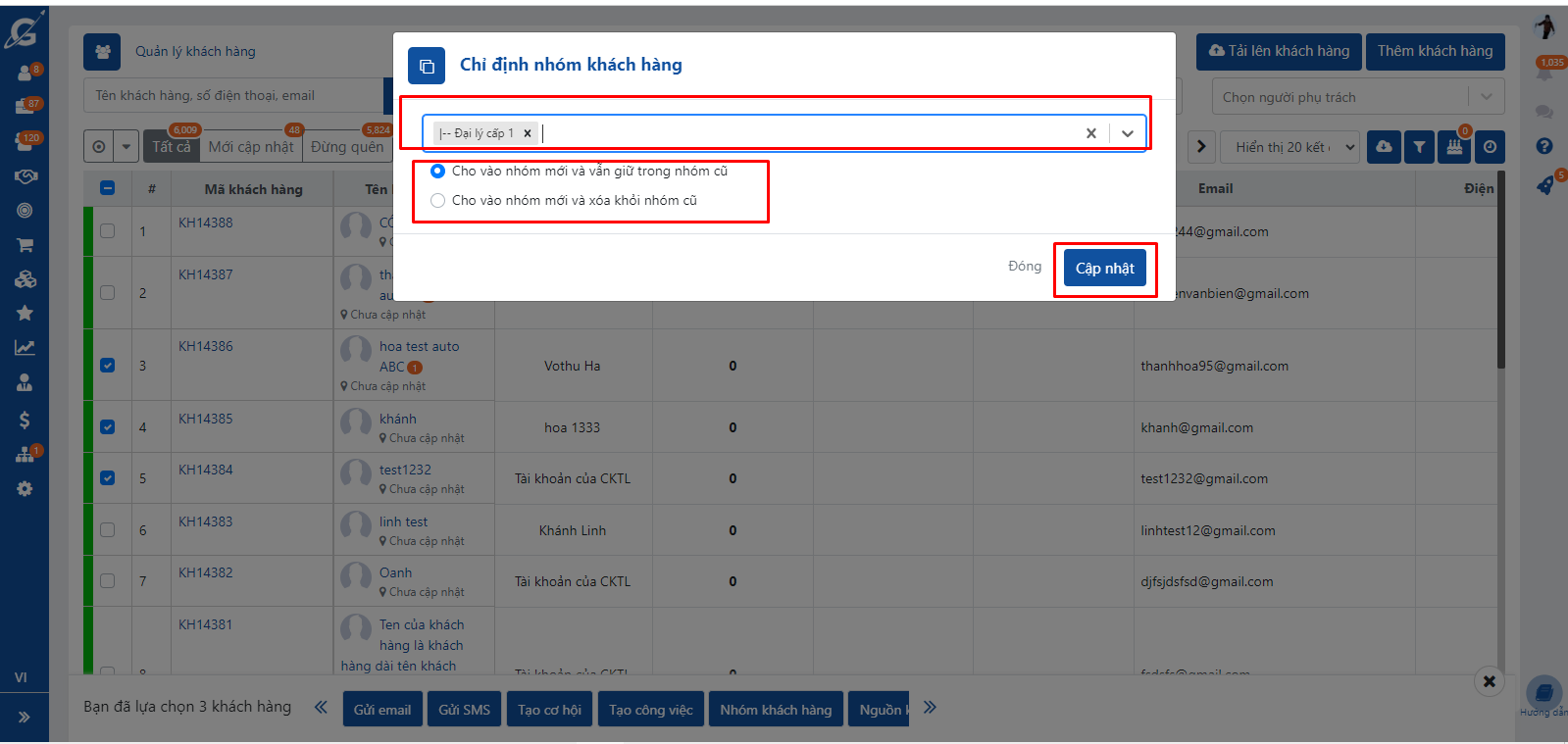 Để thêm các khách vào nhóm khách hàng, anh/ chị thao tác vào phần Khách hàng => Chọn các khách hàng muốn thêm vào nhóm Đại lý => Chọn Nhóm đại lý muốn thêm vào.