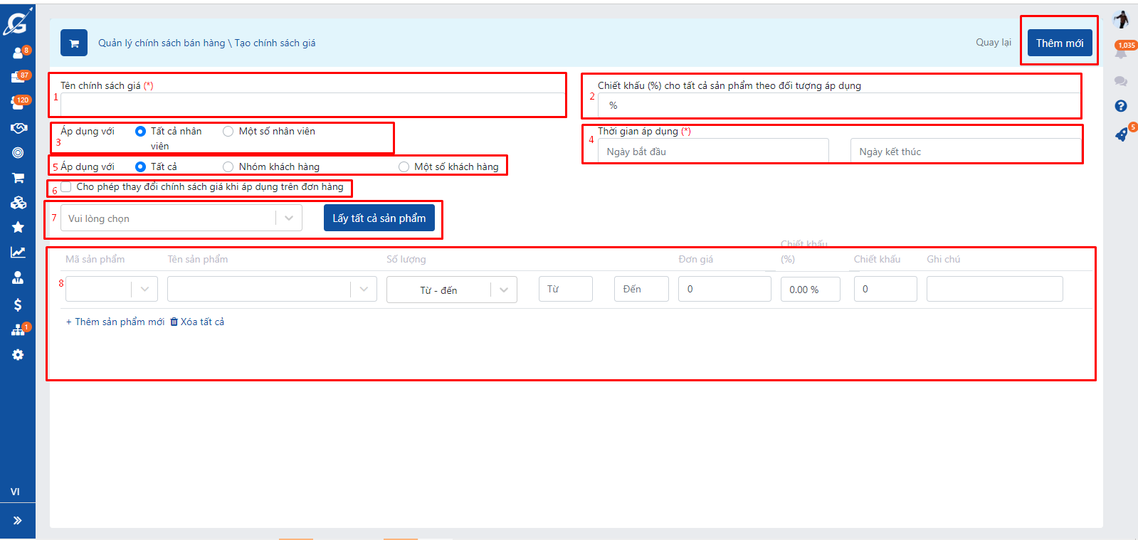 Anh/ chị thao tác vào mục Chính sách giá và Thêm mới.