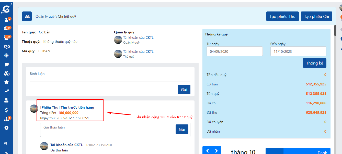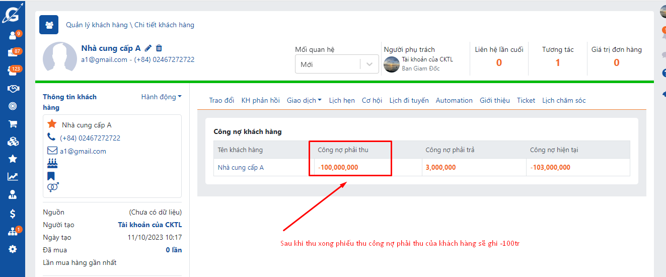 Sau khi thu tiền từ phiếu thu này: Công nợ phải thu của khách hàng sẽ ghi nhận âm bằng số tiền khách hàng nộp trước, và quỹ sẽ được cộng thêm số tiền này.