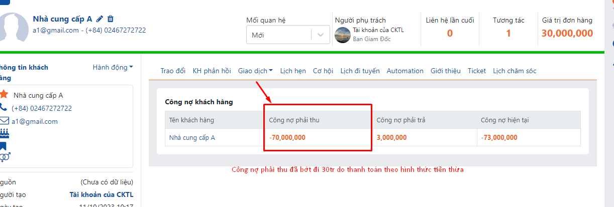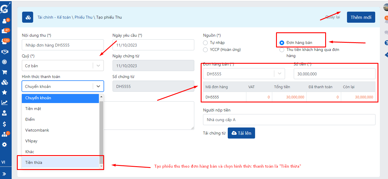 Bước 3: Thanh toán đơn hàng bán bằng hình thức tiền thừa trong phiếu thu tiền Hệ thống Getfly sẽ có riêng 1 hình thức thanh toán trong đơn hàng là "Tiền thừa" Khi khách hàng phát sinh đơn hàng và mong muốn thanh toán bằng khoản đã đặt cọc trước: Chọn Thanh toán --> Phiếu thu --> Hình thức thanh toán "Tiền thừa" => Tình trạng đơn hàng là đã thanh toán, tiền từ phiếu thu này sẽ không được cộng vào quỹ, và công nợ của khách hàng sẽ thay đổi