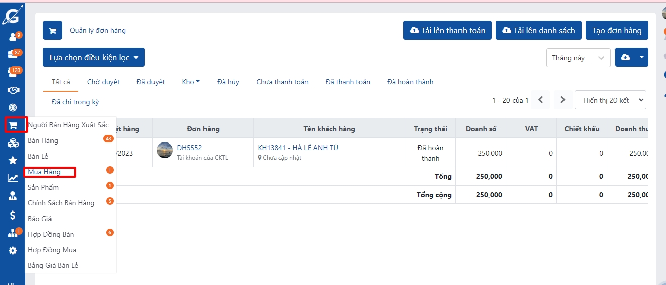 Vào Bán hàng (F4) => Mua hàng => Tạo đơn hàng bằng cách thêm mới từng đơn hoặc upload đơn hàng mua theo file excel mẫu