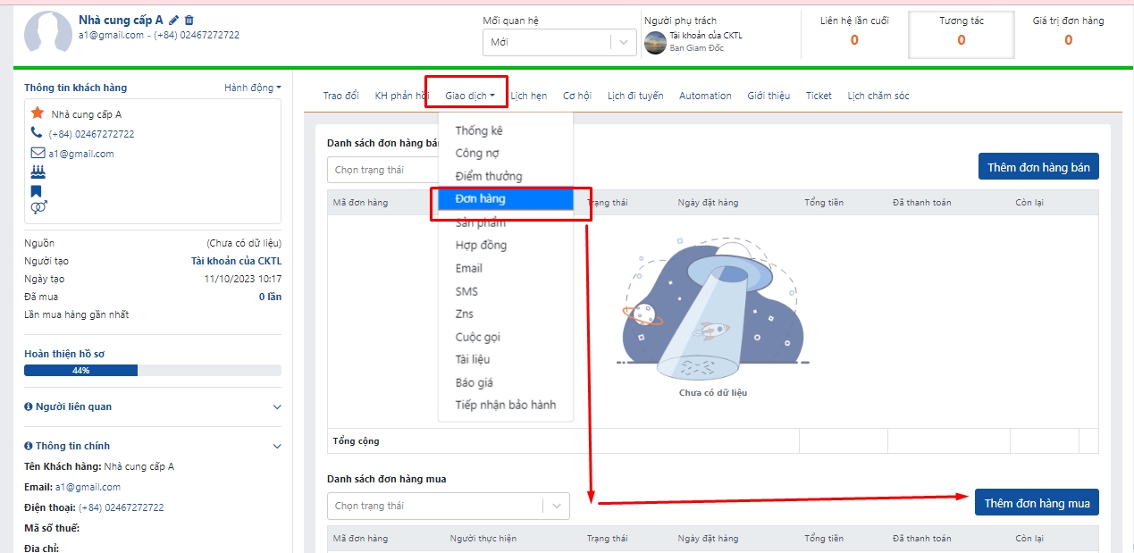 Vào chi tiết Nhà cung cấp => chọn GIAO DỊCH => ĐƠN HÀNG => chọn Thêm đơn hàng mua