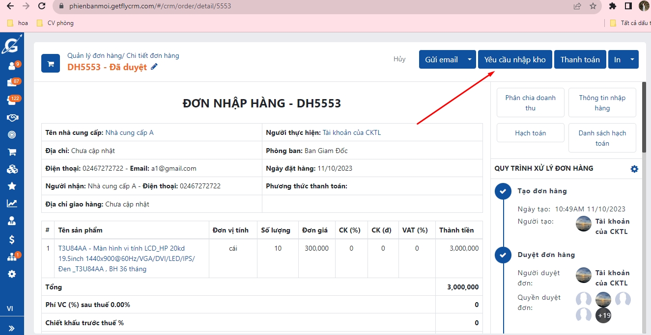 Sau khi bạn tạo và duyệt một đơn hàng mua với nhà cung cấp => ấn vào nút Yêu cầu nhập kho để nhập sản phẩm mua vào Kho tương ứng
