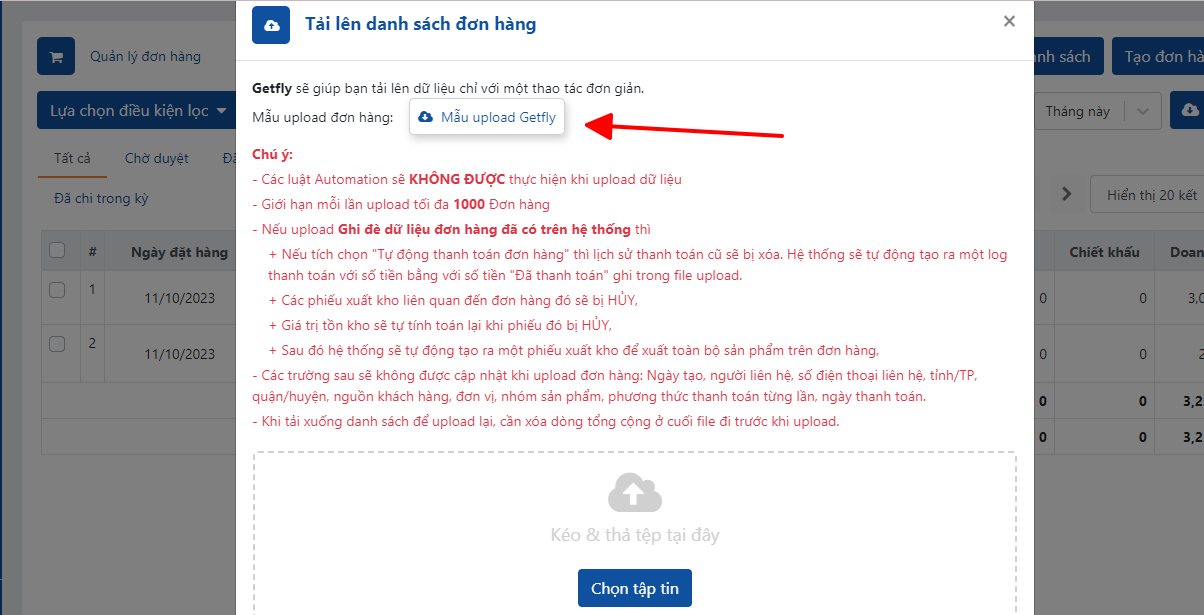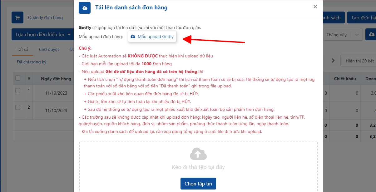 - Vào Bán hàng (F4) -> Mua hàng -> Chọn Upload -> Chọn file mẫu upload đơn hàng -> Tải xuống mẫu theo Getfly