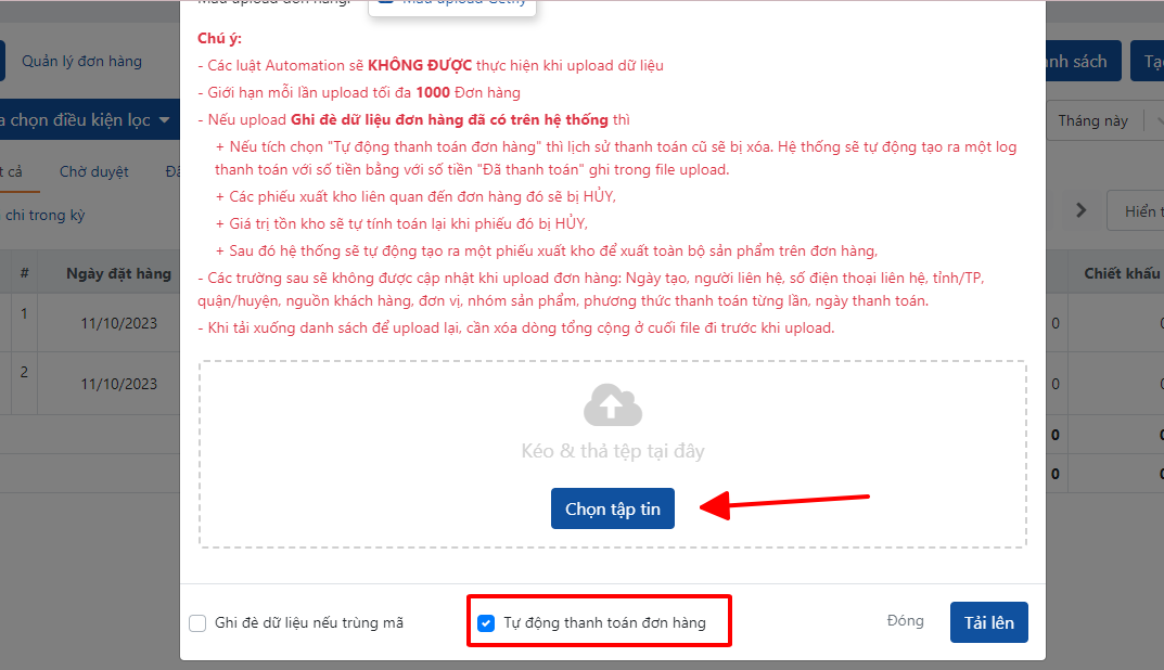 - Sau khi điền xong thông tin trong file, bạn lưu lại và click chọn Upload đơn hàng nhập lên hệ thống. Nếu đơn hàng đã thanh toán, chọn Tự động thanh toán đơn hàng, nếu đơn hành chưa thanh toán thì bỏ tích phần này