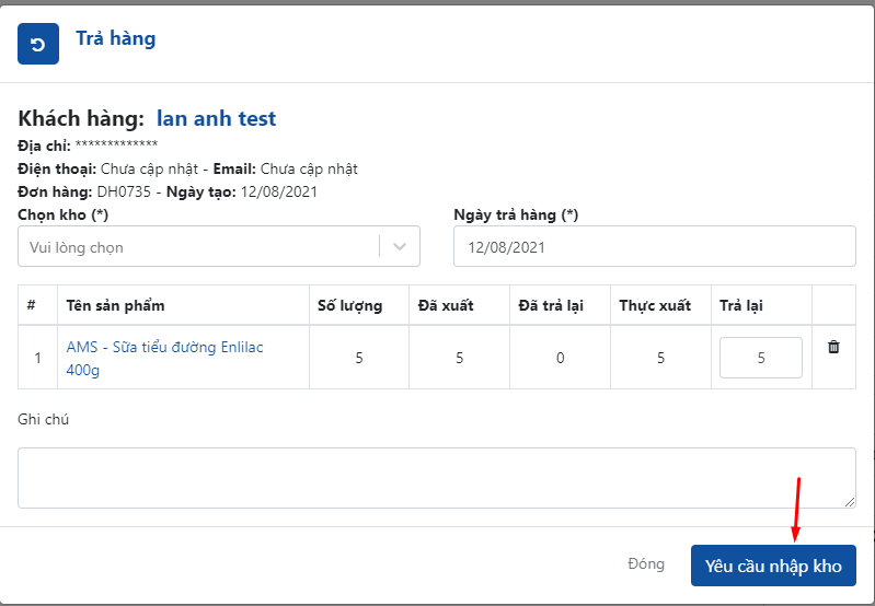 Chọn kho nhập lại sản phẩm -> Yêu cầu nhập kho