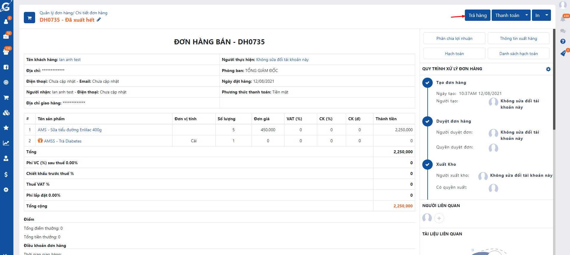 - Anh/chị vào chi tiết đơn hàng -> Trả hàng (xóa sản phẩm thực xuất, chỉnh sửa số lượng, chỉ để lại số lượng sản phẩm thực tế bị trả lại) -> Yêu cầu nhập kho
