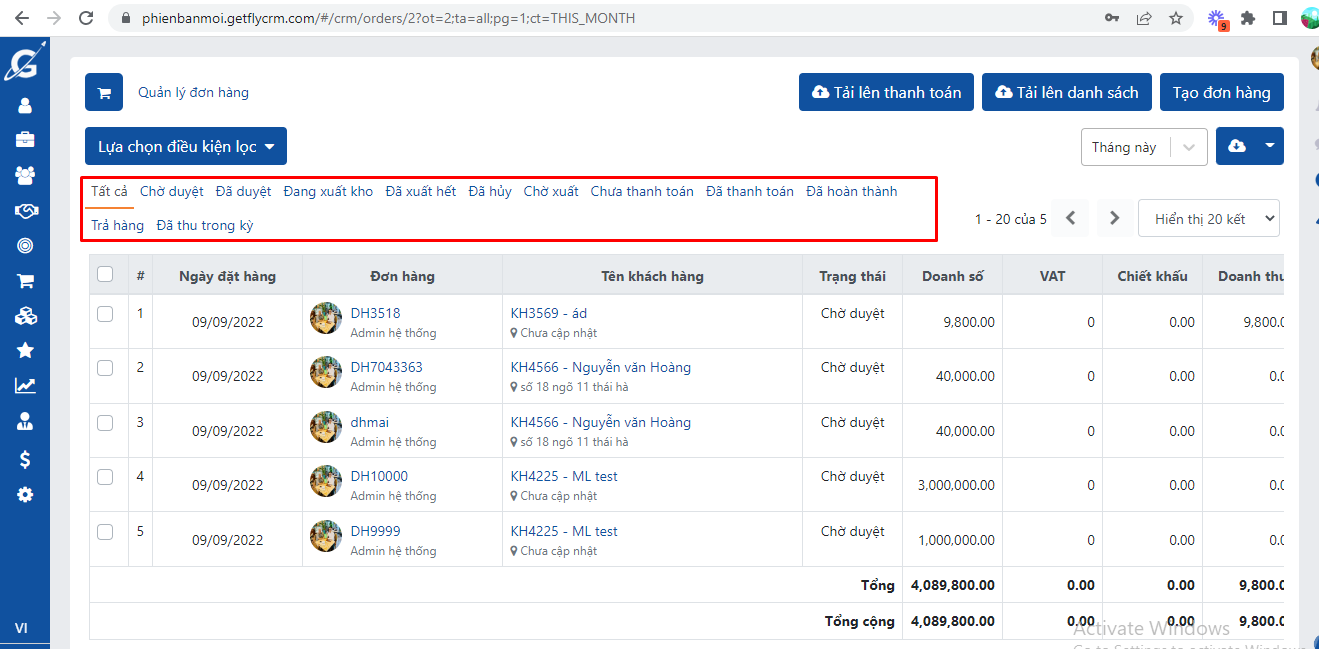 1. Khi tạo mới đơn hàng -> đơn hàng sẽ nằm trong trạng thái CHỜ DUYỆT (Nếu sử dụng quy trình duyệt đơn hàng)