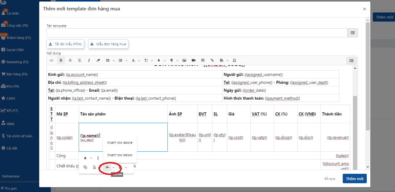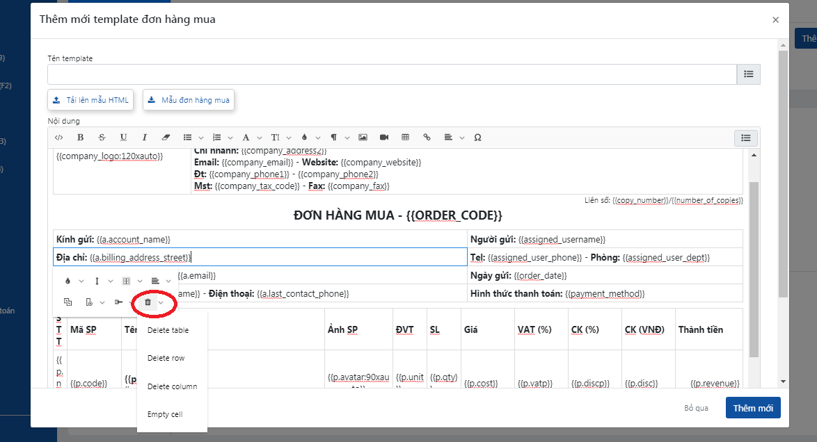 4. Hướng dẫn một số tác vụ đơn giản khi chỉnh sửa trên "Mẫu đơn hàng mua"