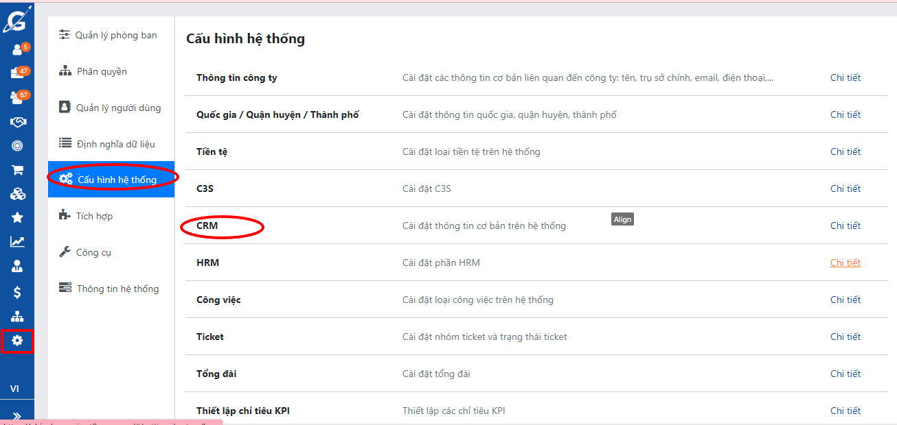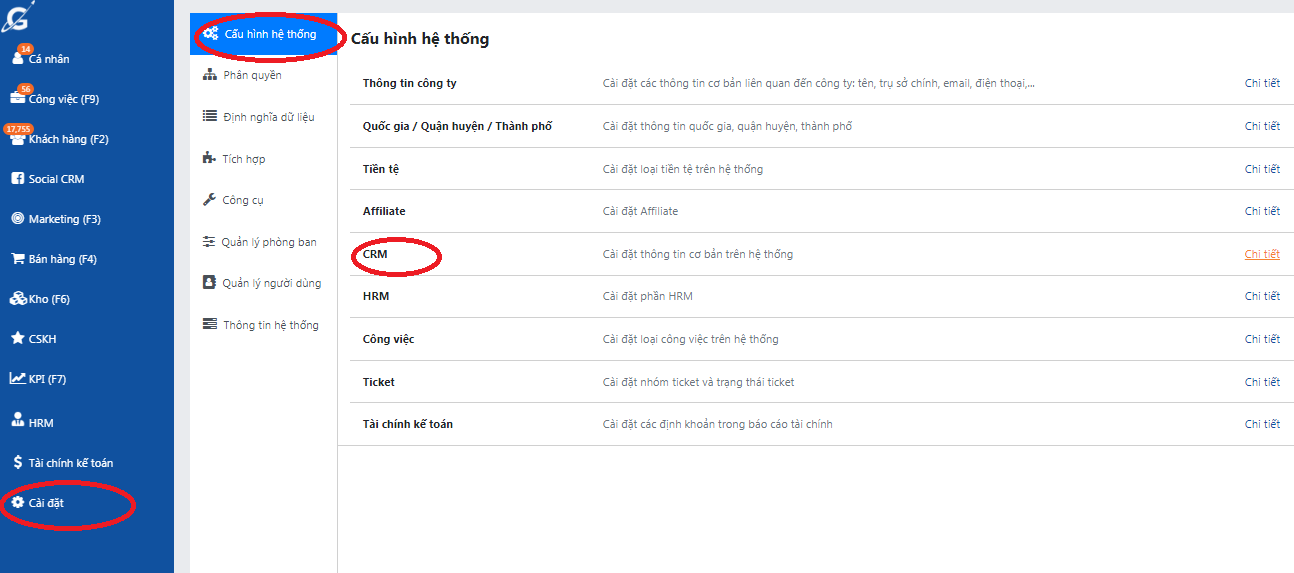 1. Click vào tác vụ "Cài đặt" -> Chọn "Cấu hình hệ thống" -> Chọn "CRM"
