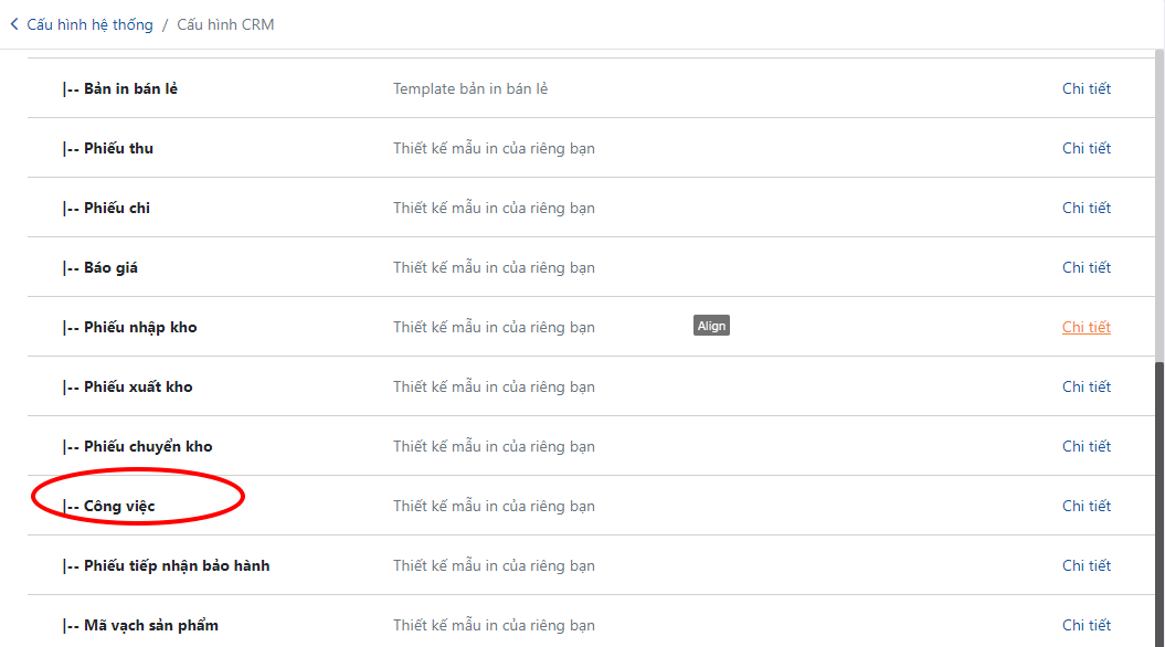 2. Chọn "Template bản in". Tại đây sẽ hiển thị các loại bản in công việc có thể chỉnh sửa