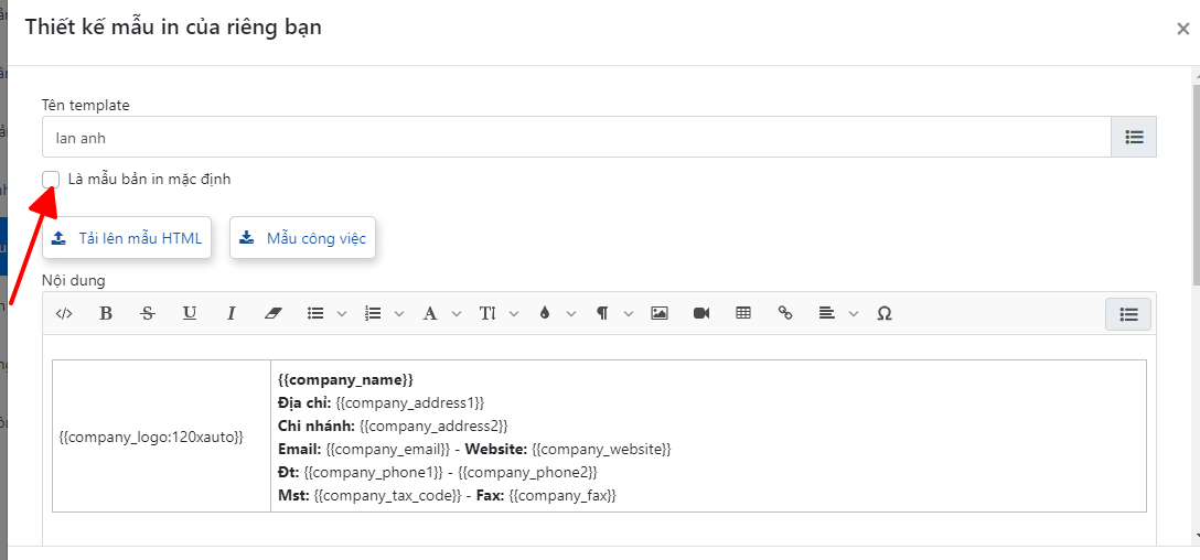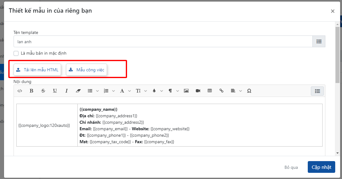 - "Tải lên mẫu HTML" : anh/chị sẽ tạo mẫu HTML và upload lên Getfly qua đây.