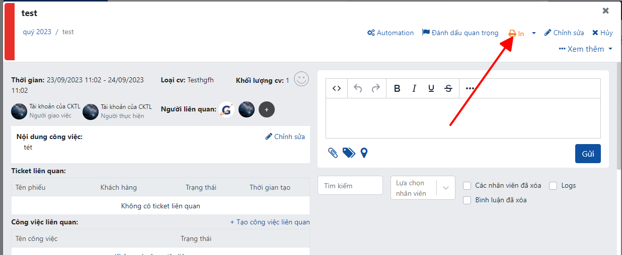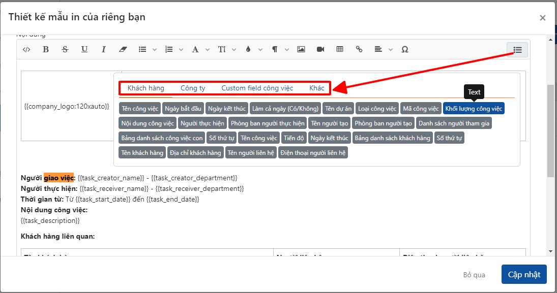 4. Để thêm biến người tạo việc vào bản in công việc
