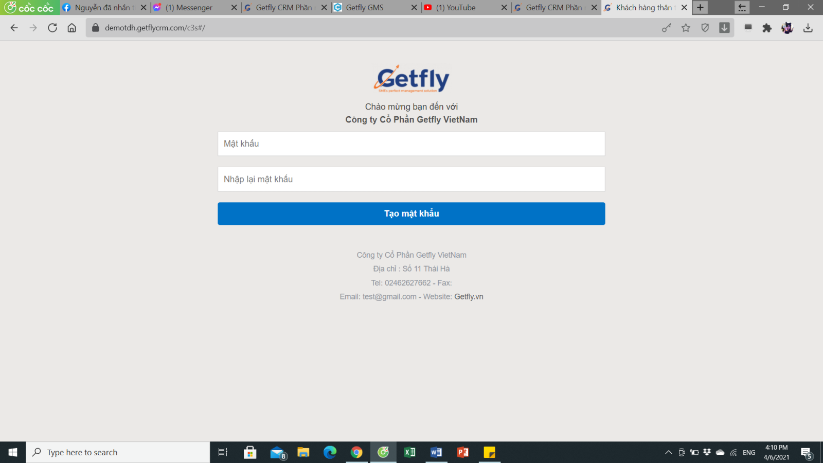 Tạo mật khẩu (Lưu ý: Anh chị nên tạo mật khẩu dễ nhớ, có thể để mật khẩu trùng với mật khẩu hệ thống Getfly của doanh nghiệp mình)